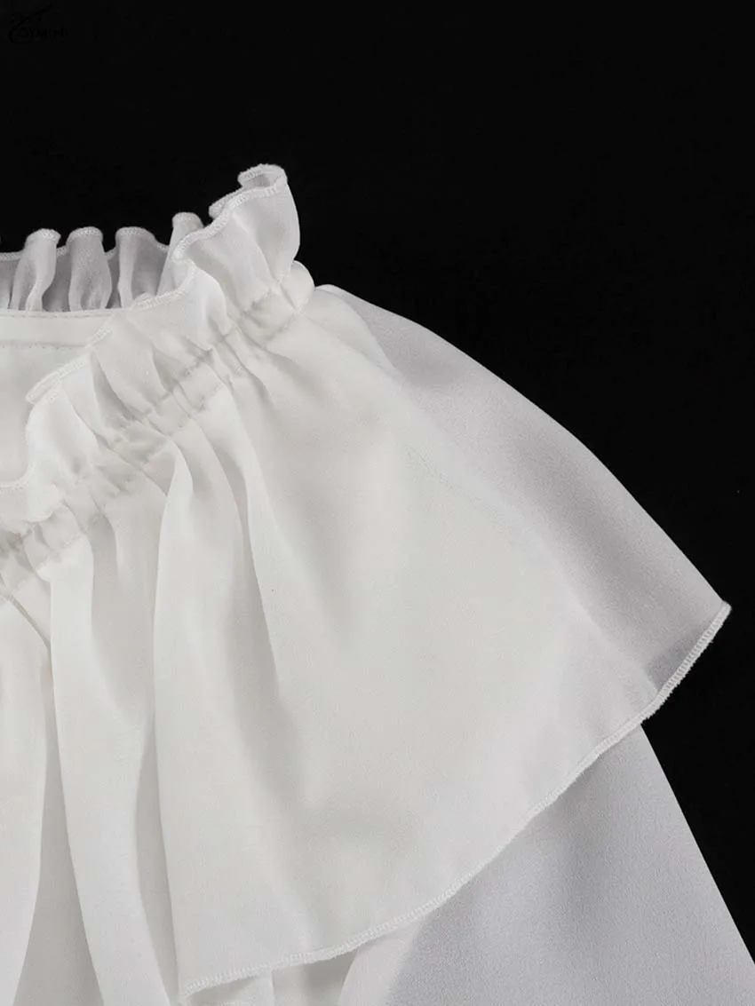 Oymimi Elegant White Ruffled Dresses 2025 Woman Fashion V-Neck Lace-Up Long Sleeve Dresses Casual High Waist Floor-Length Dress