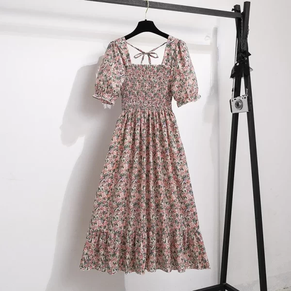 Spring Summer Chiffon Dresses Fashion Female Elastic Waist Short Sleeve Pleated Casual Dress Women A-line Dresses Vestidos