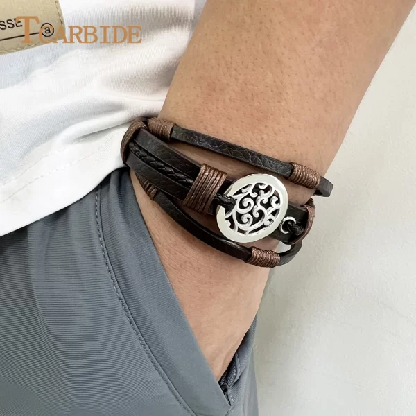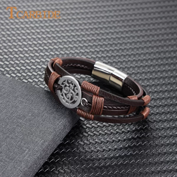 Three-Layer Men’s Fashion Premium Genuine Leather Bracelets Stainless Steel Magnetic Clasp Charming Geometric Pattern Jewelry